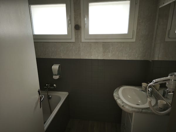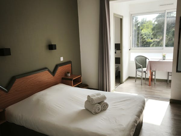 La chambre double dispose d'une salle de bain privative avec baignoire et sèche-cheveux, de WC séparé, de la climatisation et d'une armoire. Elle dispose également d'une télévision à écran plat, du chauffage, d'un bureau et d'un petit coin détente.