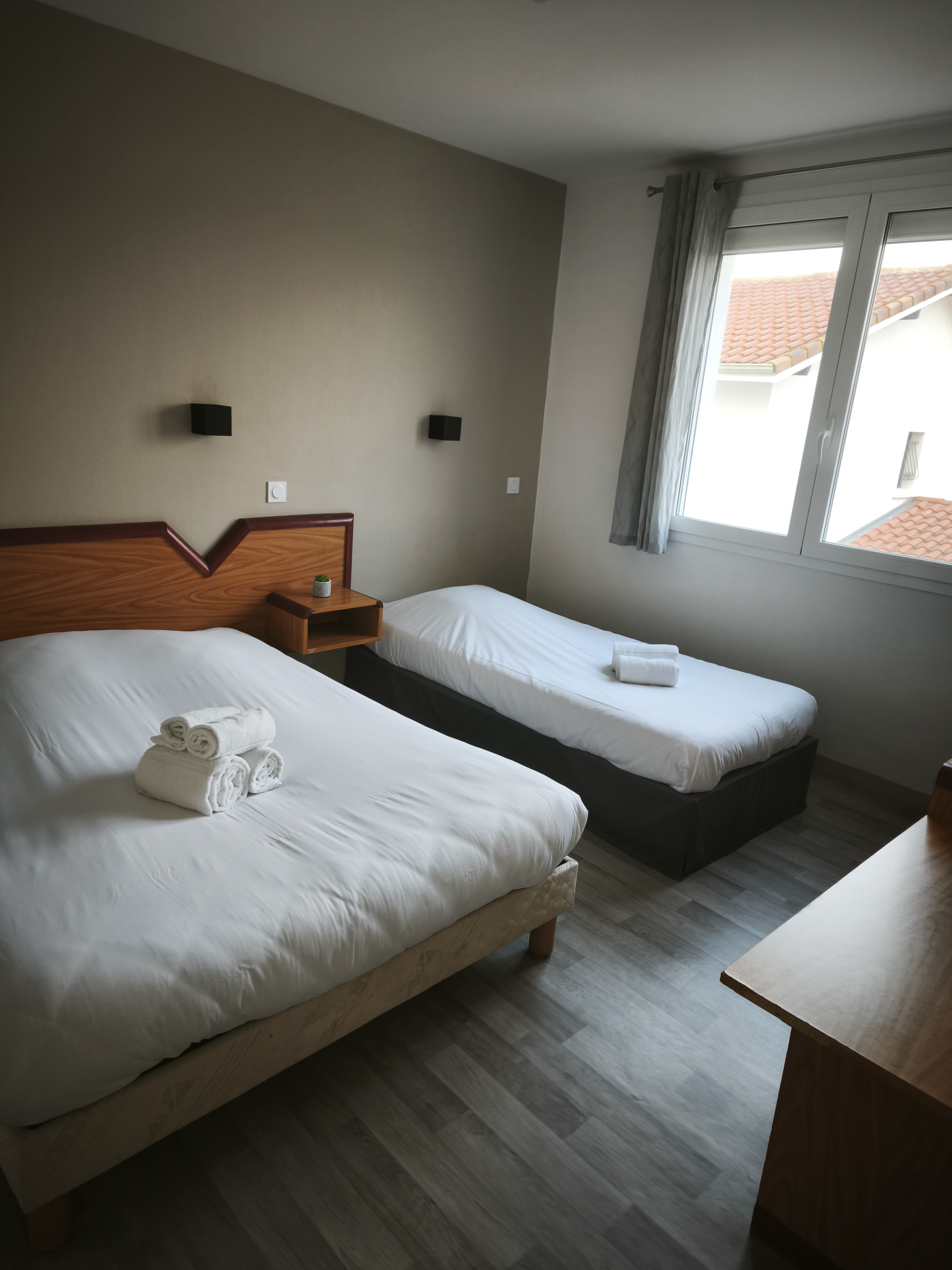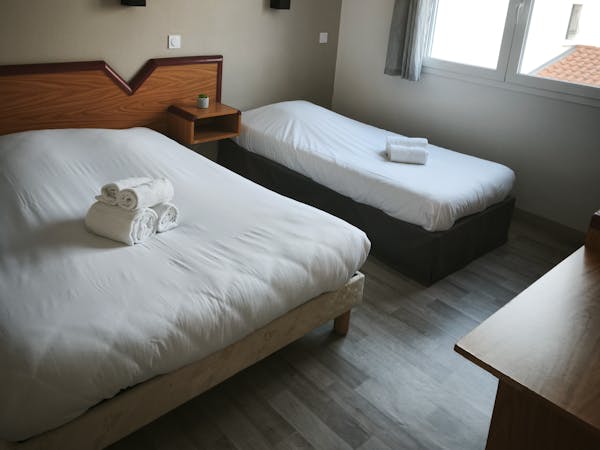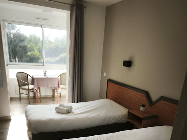 La chambre twin dispose de deux lit simple, de la climatisation/chauffage, d'une armoire et d'une salle de bains privative avec douche et sèche-cheveux et de WC séparé. Elle dispose également d'un bureau d'une télévision à écran plat et d'un petit coin détente.
