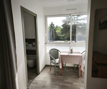 La chambre double dispose d'une salle de bain privative avec baignoire et sèche-cheveux, de WC séparé, de la climatisation et d'une armoire. Elle dispose également d'une télévision à écran plat, du chauffage, d'un bureau et d'un petit coin détente.