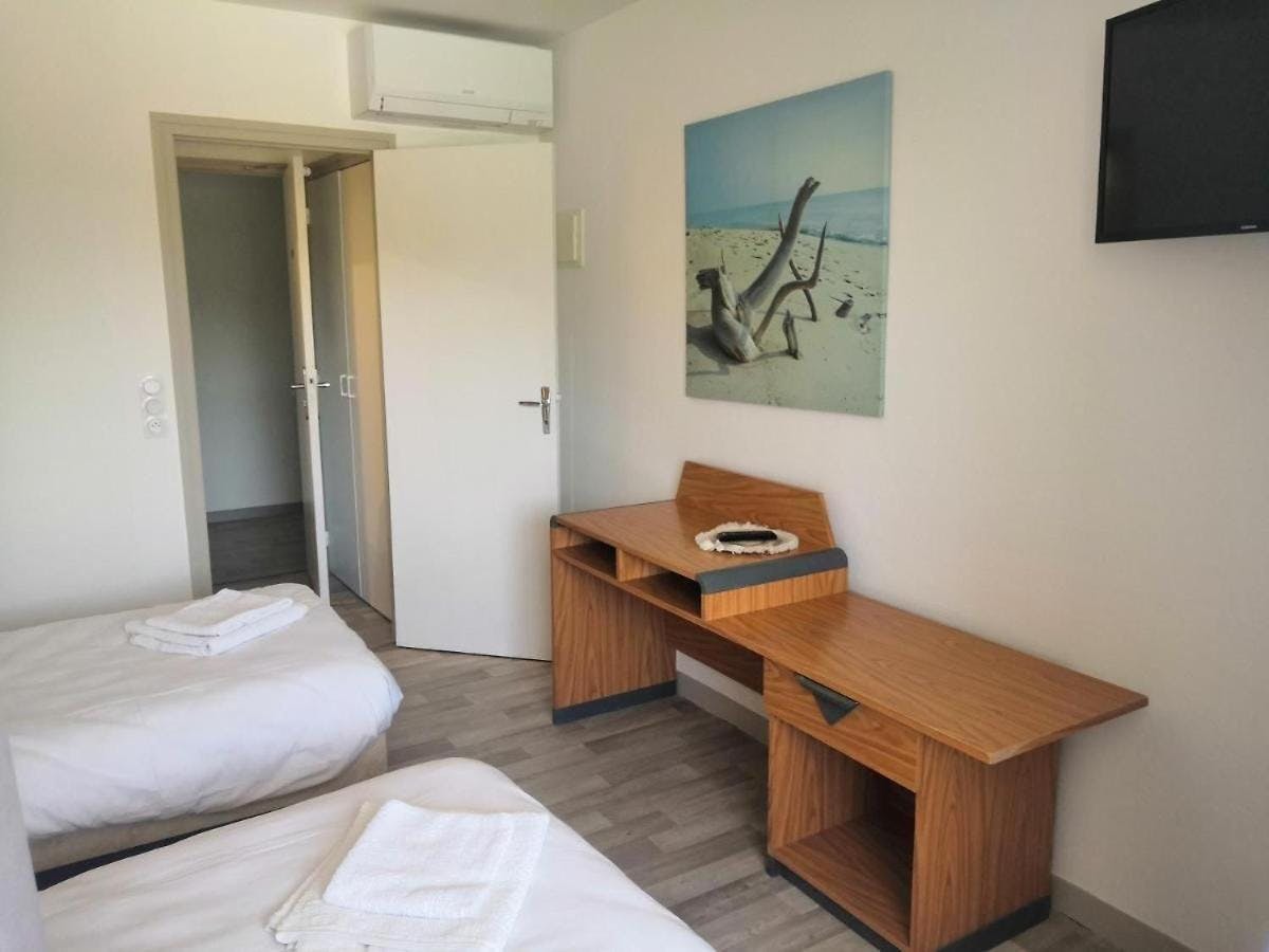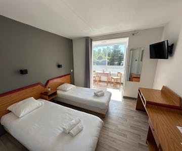 La chambre twin dispose de deux lit simple, de la climatisation/chauffage, d'une armoire et d'une salle de bains privative avec douche et sèche-cheveux et de WC séparé. Elle dispose également d'un bureau d'une télévision à écran plat et d'un petit coin détente.
